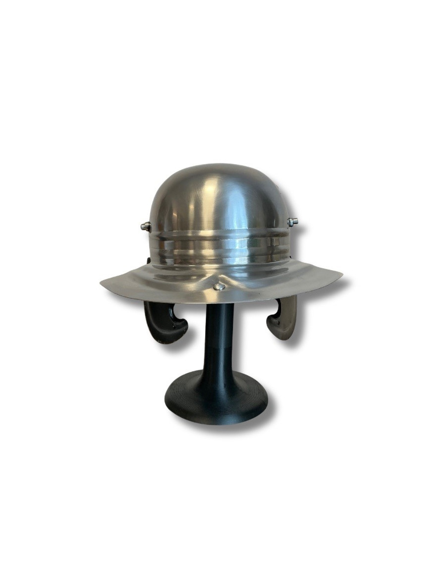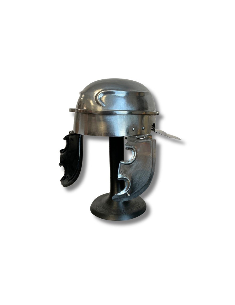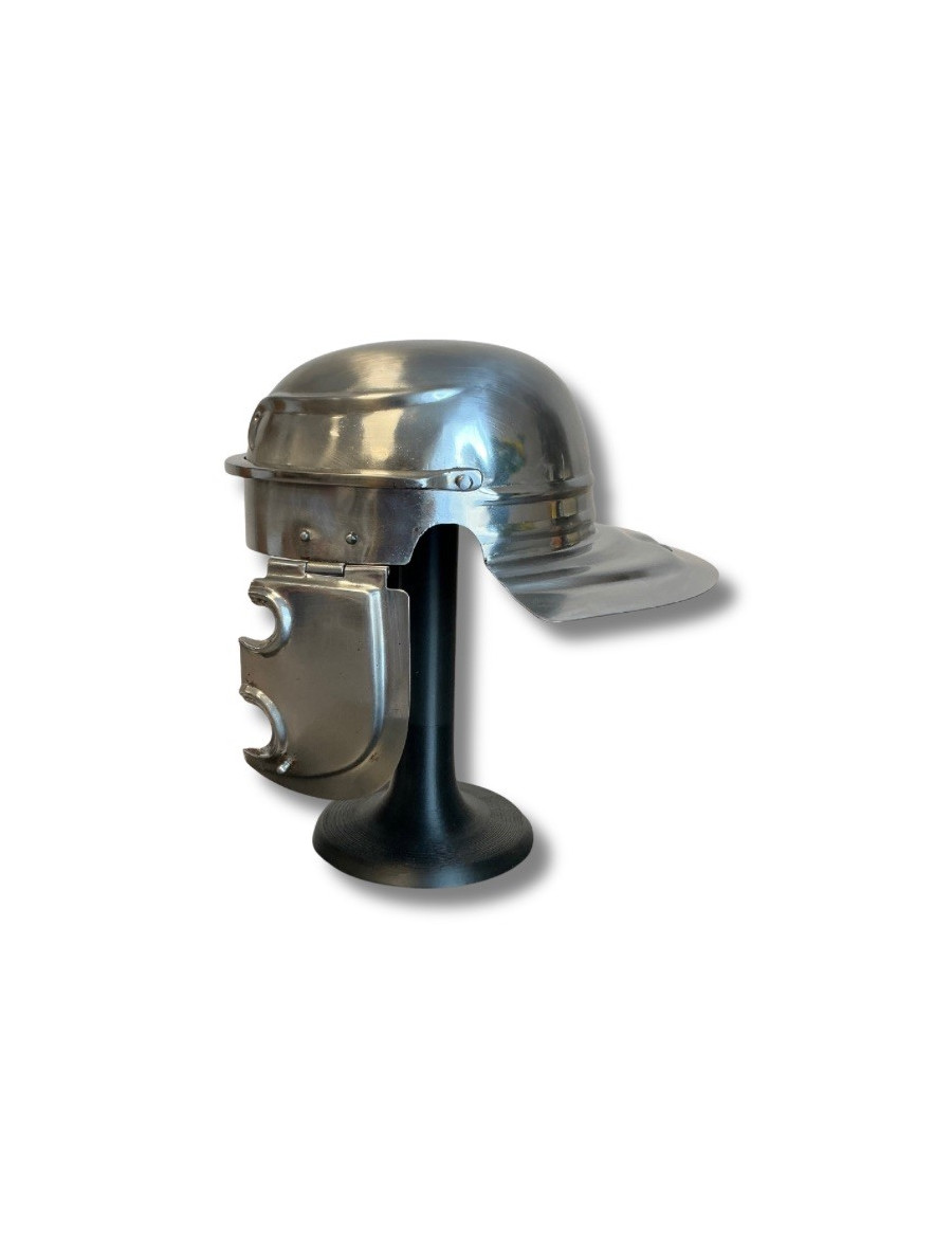 Voici le galea du centurion Flavius Marcellus, vétéran des campagnes de Germanie et commandant de la Xᵉ Légion Equestris. Forgé à Lugdunum par les artisans du fer sacré, ce casque brillait comme un miroir sous le soleil de la Via Augusta. Ses paragnathides (protège-joues) portaient les marques de nombreuses batailles, car Flavius menait toujours ses hommes au front, glaive au poing, criant "Roma Victor !" entre les lignes ennemies. Le rebord arrière courbé protégeait sa nuque des flèches barbares, tandis que les élégantes volutes frappées sur les flancs évoquaient la gloire de Mars. On dit que ce casque ne toucha jamais le sol, porté jusqu’à la fin par un homme que même le temps ne put courber.