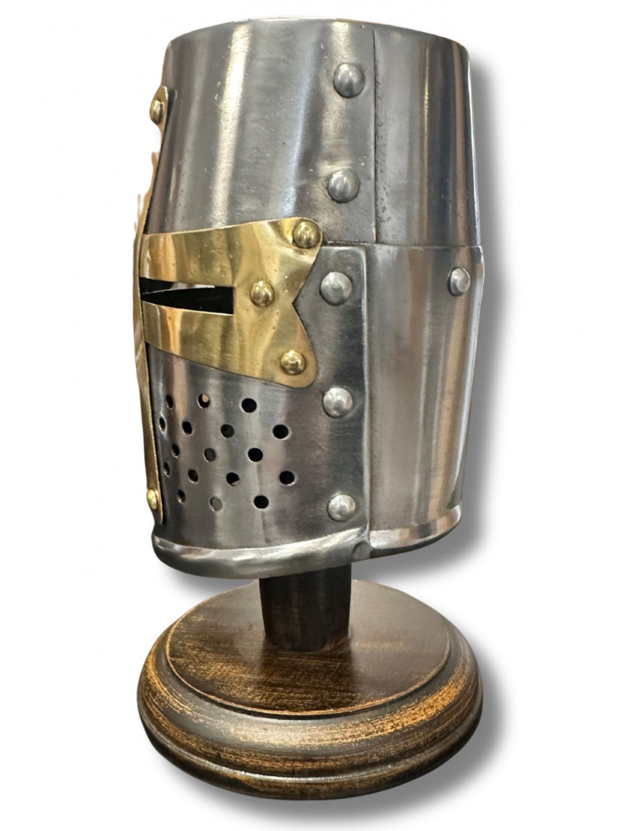 Ce mini casque décoratif reproduit fidèlement la forme d’un heaume médiéval de type cylindrique, inspiré des équipements portés par les chevaliers aux XIIᵉ et XIIIᵉ siècles. Fabriqué en métal à finition argentée, il présente une structure robuste et épurée, caractéristique des casques utilisés durant les croisades.