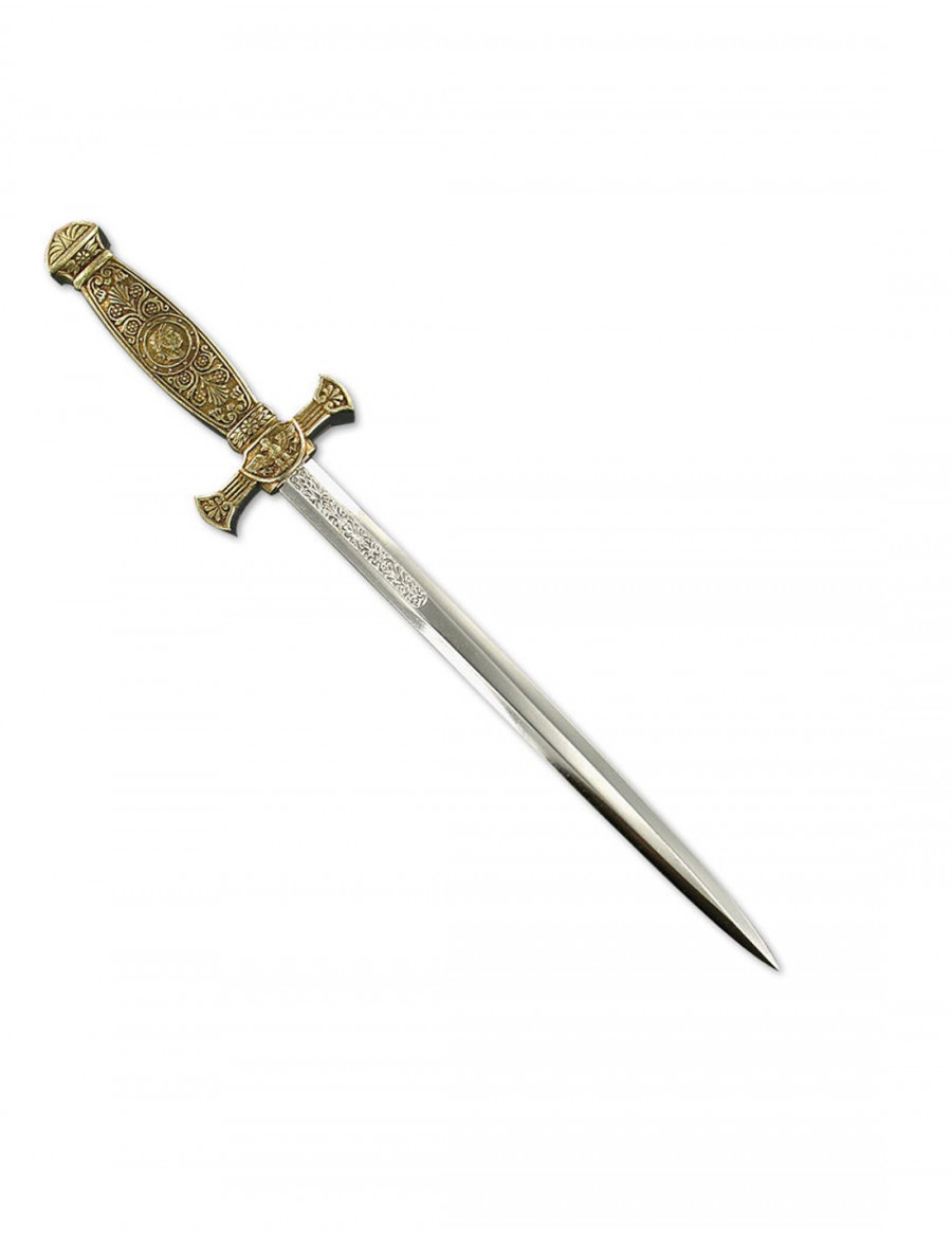 Bien que née dans une ère post-médiévale, cette dague évoque la grandeur d’un empire forgé par le feu et la volonté. On dit qu’elle fut offerte à un officier de la Garde Impériale, le capitaine Léonard de Brienne, en récompense de son courage à la bataille d’Austerlitz. L’aigle impérial sur la garde symbolisait sa loyauté indéfectible à l’Empereur, tandis que la lettre « N » et la couronne rappelaient l’origine impériale de son commandement. Gravée de son profil, la poignée dorée immortalisait la figure de Napoléon, comme un serment gravé dans l’or. Accrochée à la ceinture des plus fidèles serviteurs du trône, cette dague n’était pas seulement une arme, mais un emblème d’honneur, transmise de génération en génération comme un héritage glorieux.