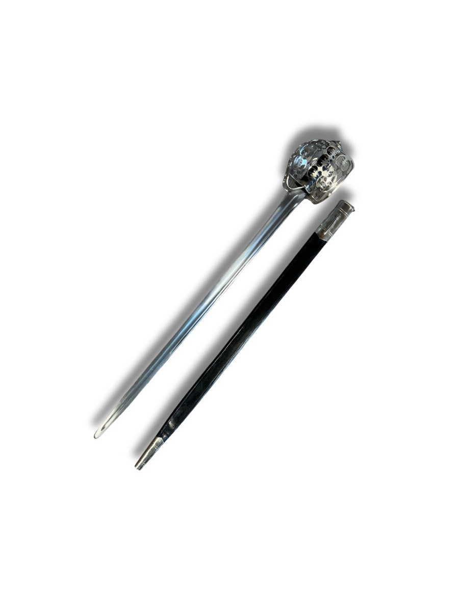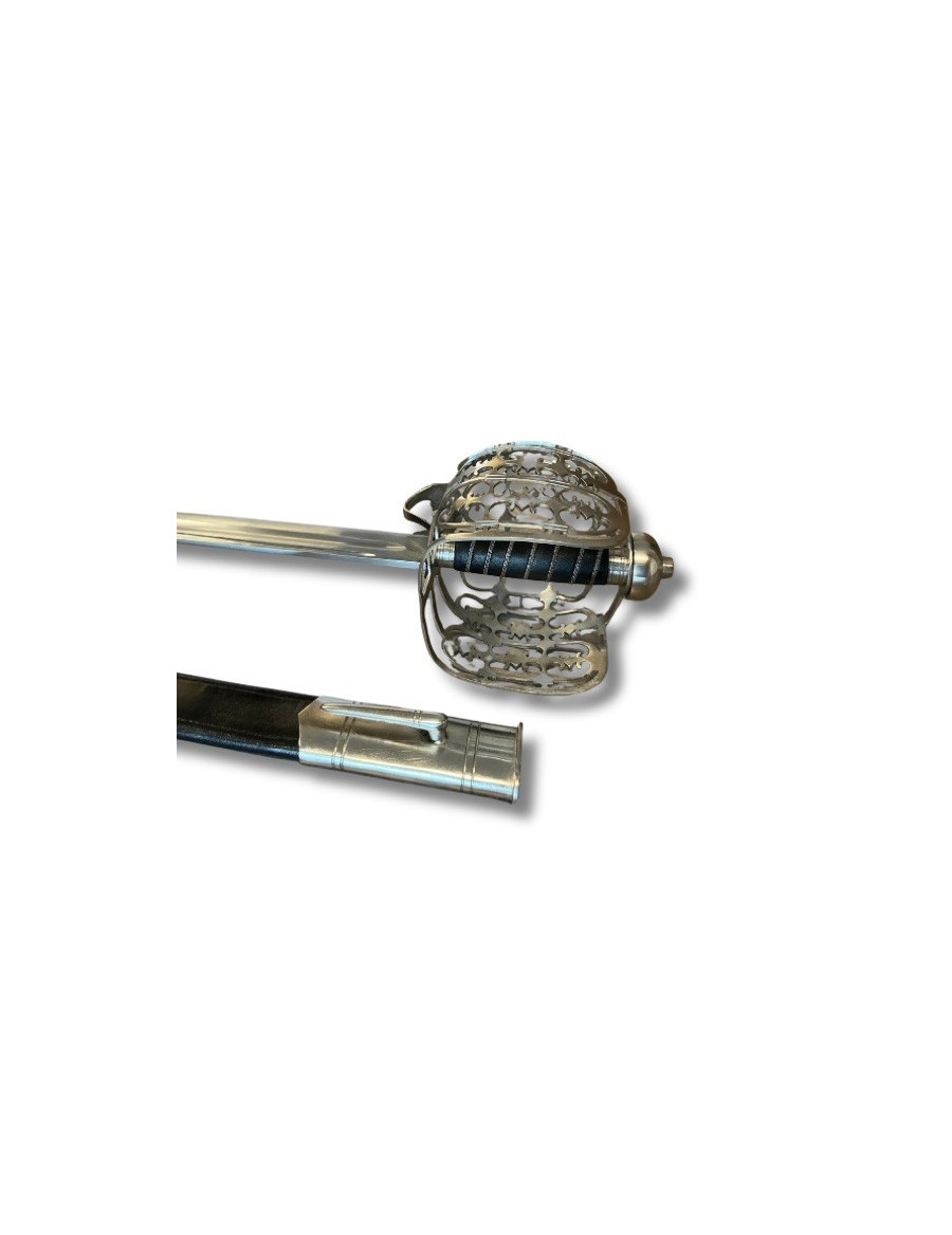 Cette élégante épée est une réplique inspirée des armes portées par les officiers écossais aux XVIIᵉ et XVIIIᵉ siècles. Dotée d’une longue lame droite en acier poli, elle est parfaitement équilibrée pour le combat comme pour la parade. Sa garde en panier finement ajourée protège la main avec distinction, arborant des motifs floraux ciselés caractéristiques du style des Highlands. Le pommeau sphérique assure une excellente tenue, tandis que la poignée gainée de cuir renforce le confort de prise. Accompagnée de son fourreau en cuir noir et métal, cette épée est idéale pour les collectionneurs, passionnés d’histoire ou reconstituteurs désireux d’incarner un noble officier des régiments écossais.