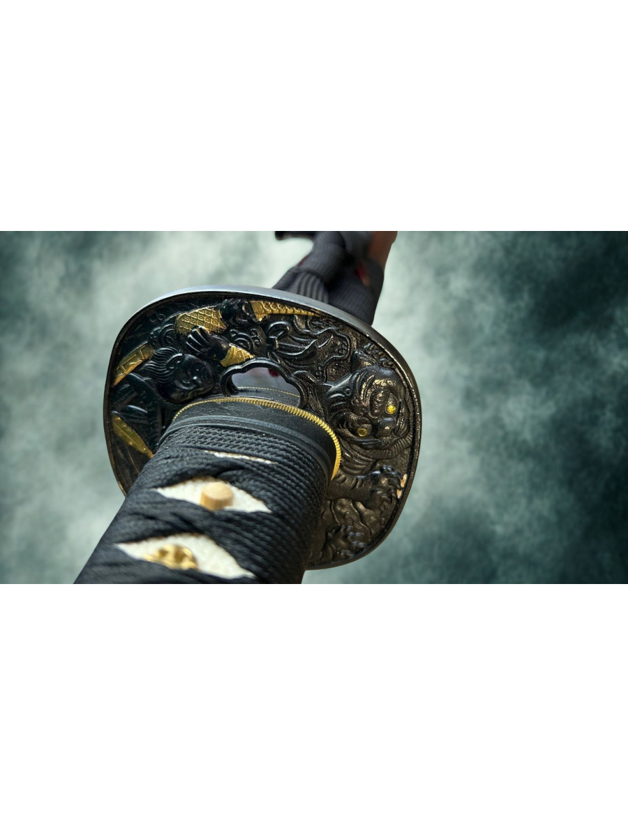 La poignée noire évoque le calme du guerrier expérimenté, tandis que le fourreau rouge profond rappelle les batailles passées et les serments scellés dans le sang. Sa garde richement décorée représenterait des esprits protecteurs, veillant sur le porteur et guidant sa lame.